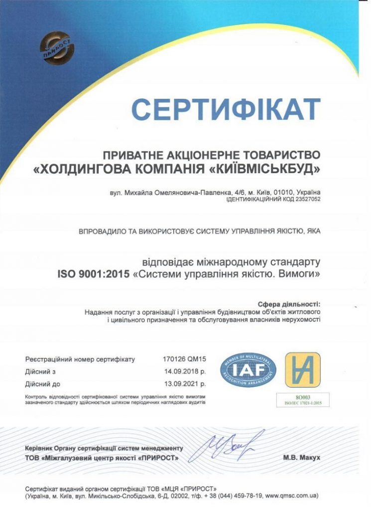 Приватне Акціонерне Товариство «Холдингова компанія «Київміськбуд» перейшла на нову версії ДСТУ ISO 9001:2015.